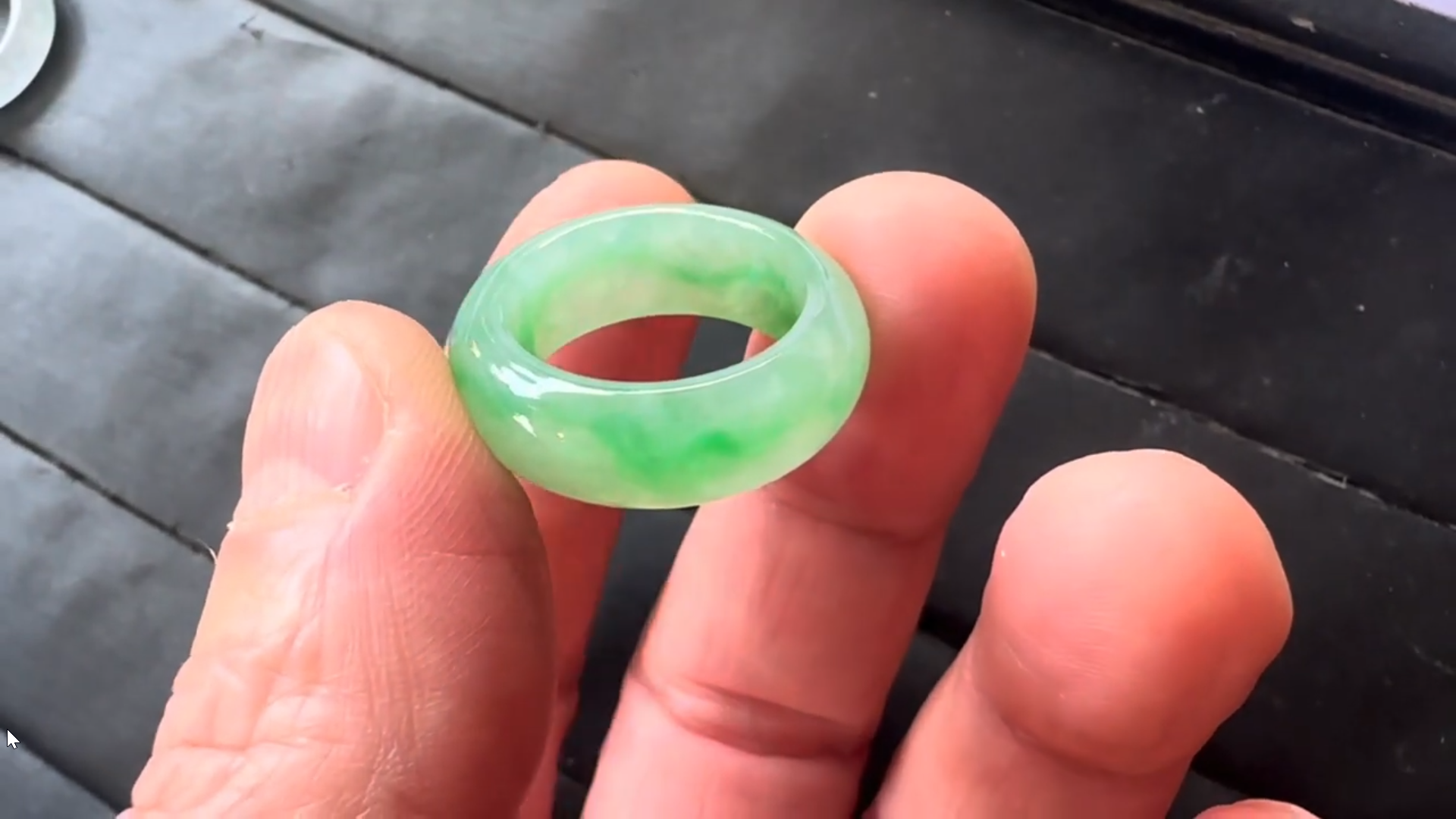 グリーンカラーが素晴らしい、くりぬきろうかん翡翠リングのご紹介となります!