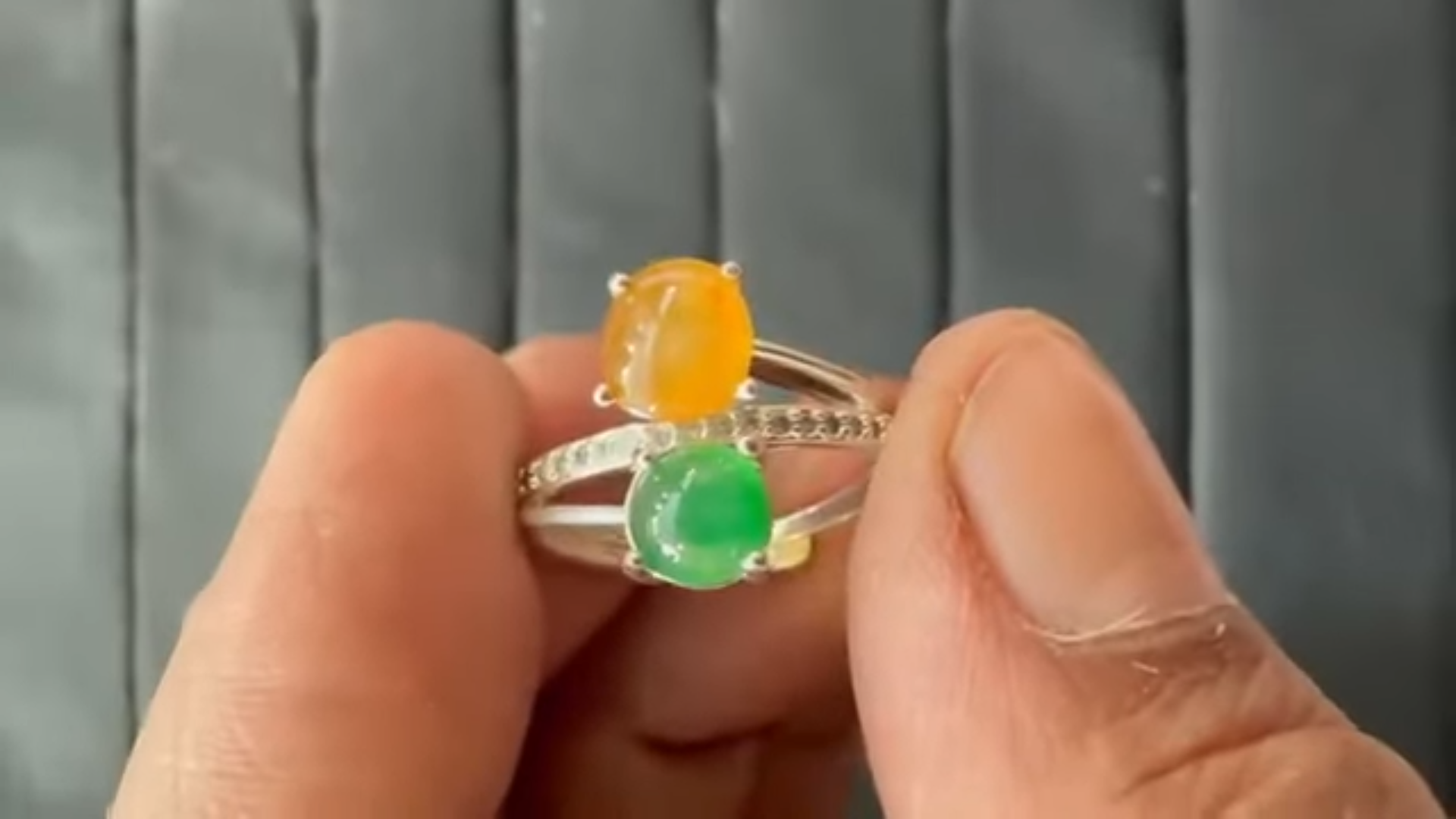 お色がキレイな、イエロー&ろうかん翡翠ペアルースファッションリングのご紹介となります。
