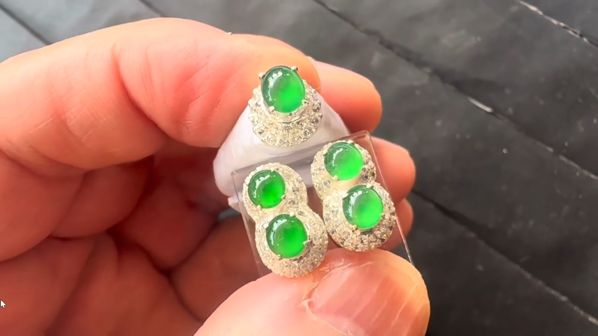 お色が素晴らしい、蛍光翡翠セットルースのご紹介となります。