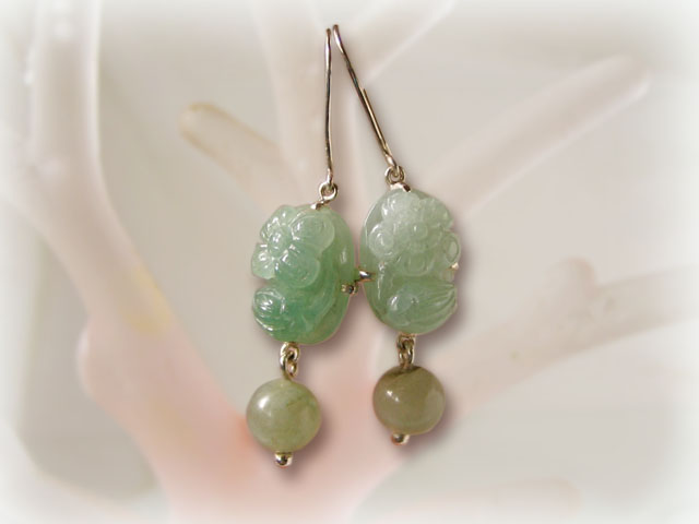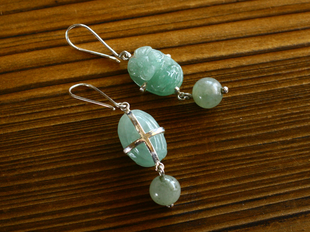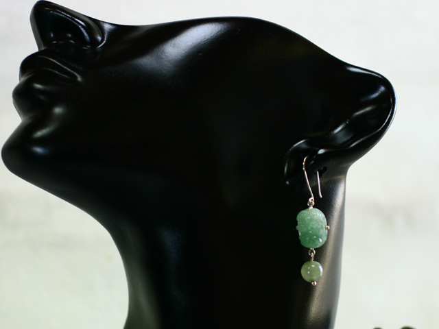 ご覧のように透明感のある本翡翠で、やや青味の落ち着いたグリーンカラーのカーヴィングとイエローグリーンカラーのビーズのピアスです。