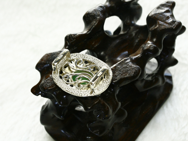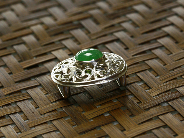 シアーでアップルグリーンにほんの少し白を足して混ぜたようなお色目の翡翠を中央に配した熟練の職人の手による繊細な銀細工の帯留めです。