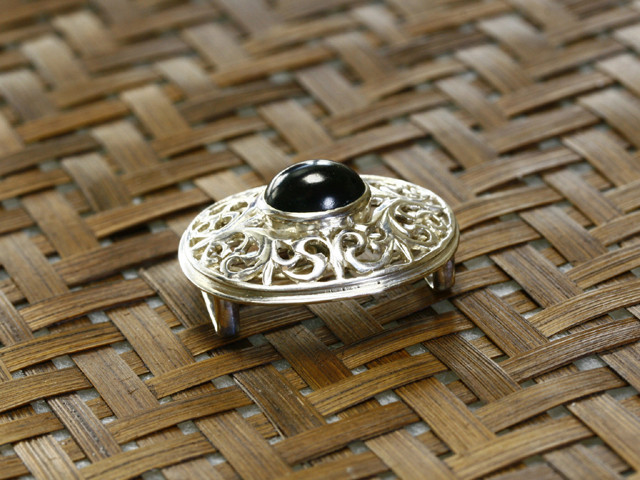 写真でお分かりいただけると思いますが、レアカラーの黒翡翠を中央に配した熟練の職人の手による繊細な銀細工の帯留めです。